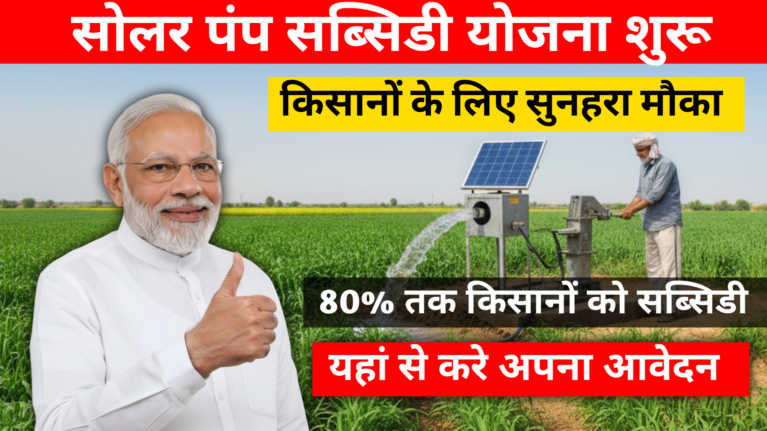 भारत सरकार किसानों की आय बढ़ाने और सिंचाई को सस्ता बनाने के लिए लगातार नई योजनाएं चल रही है इन्हीं में से एक बहुत लाभकारी योजना है सोलर पंप सब्सिडी योजना जिसके तहत किसानों को 80% तक सब्सिडी पर सोलर पंप उपलब्ध करवाया जा रहा है